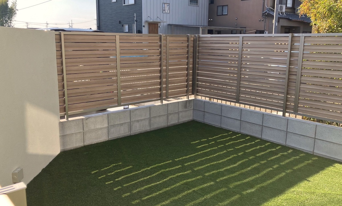 足に優しい人工芝敷きの庭にフェンスを設置してわんちゃんねこちゃんが遊べるガーデンへリノベーションしました。