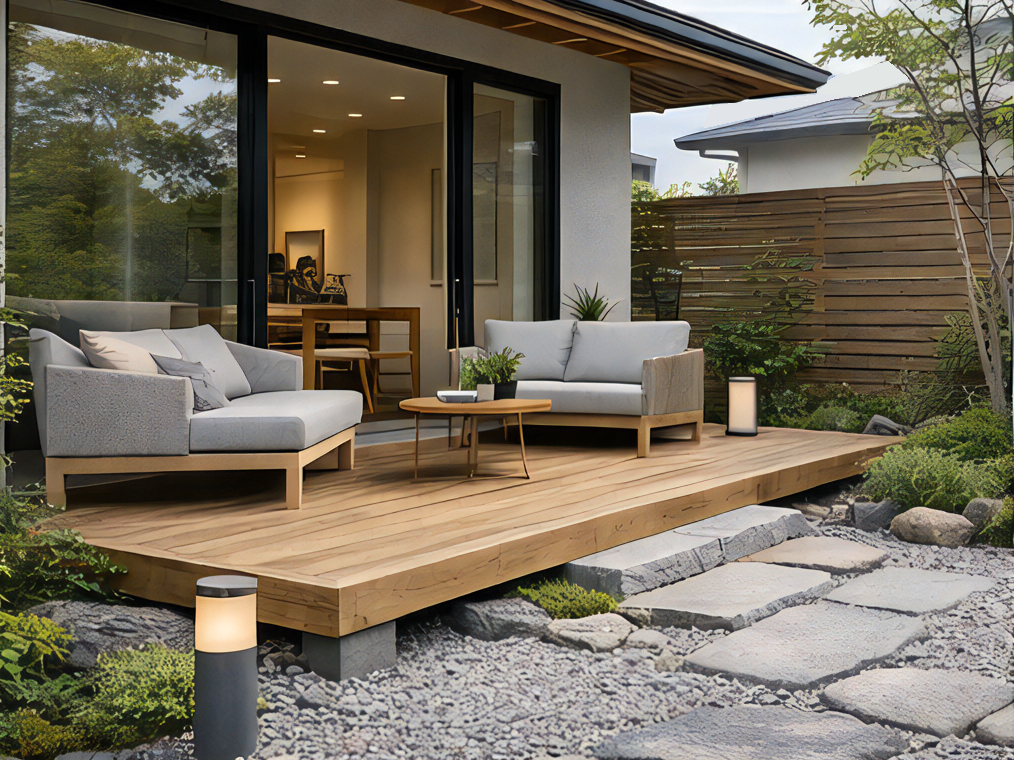 明るめの木目調フェンスや天然石を使ったアプローチなど、自然の色や素材を取り入れることで、無機質になりすぎず心地よい空間が生まれます。