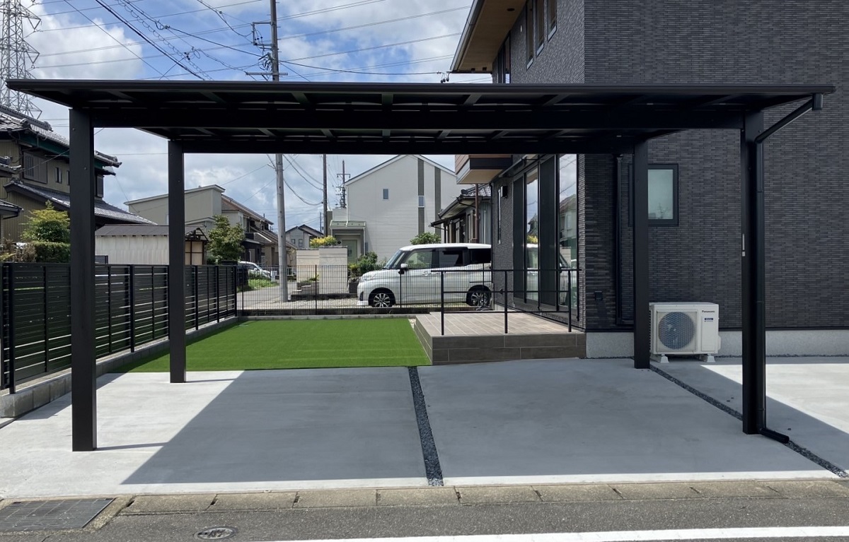 特にブラックポリカボネート屋根のカーポートは、空間を引き締めるスタイリッシュな存在感で人気です。