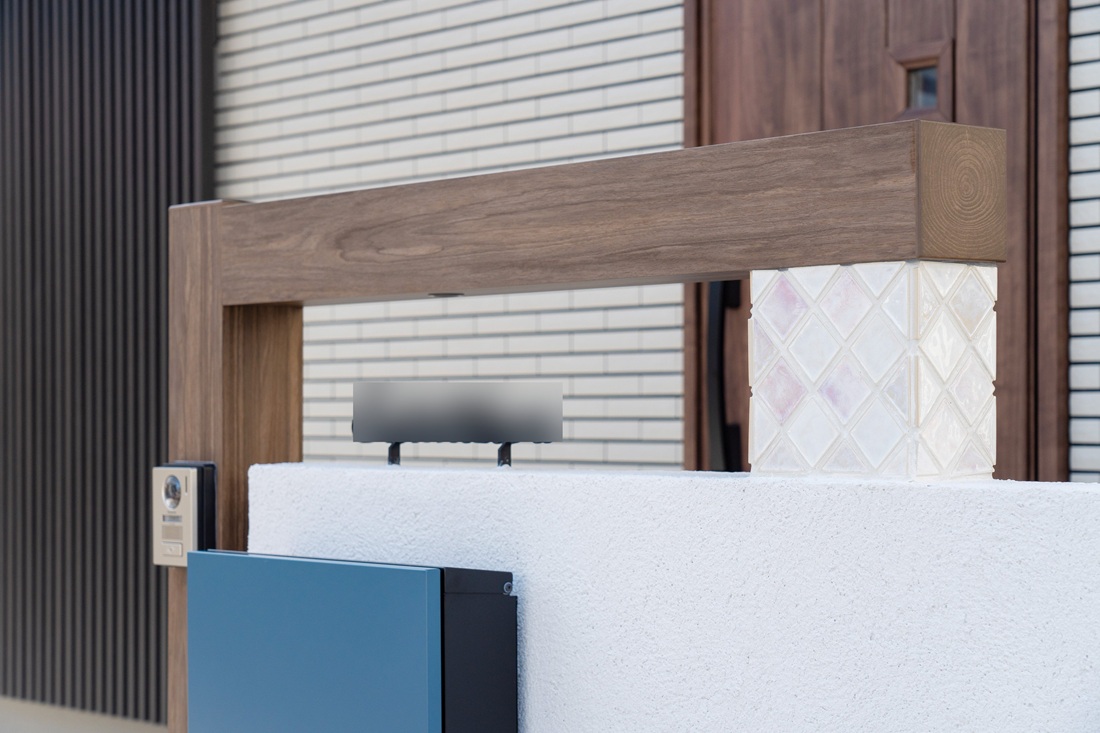 ホワイト系の木目とブラウン系の木目の門柱がオシャレな住空間を演出しています。