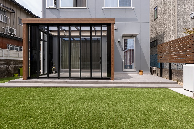 日向ぼっこをしたり、遊び回ったりできる場所としてお庭にガーデンルームを設置した施工事例。