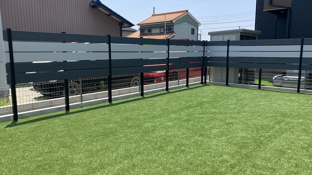 足に優しい人工芝敷きの庭にフェンスを設置してわんちゃんねこちゃんが遊べるガーデンへリノベーションしました。