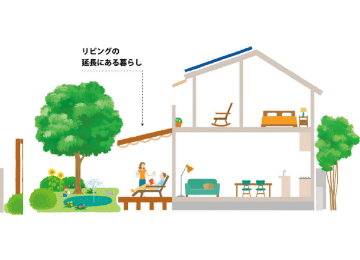 家と庭を繋ぐ「もうひとつの部屋」を創り出すことで、リビングから自然へとスムーズに移行する空間が提供されます。リビングの外にルーフやポーチを設けることにより、室内からの延長線上にありながらも、庭の自然を一望できる開放的な「部屋」が形成され、寛ぎながら自然を堪能できる生活空間が実現します。