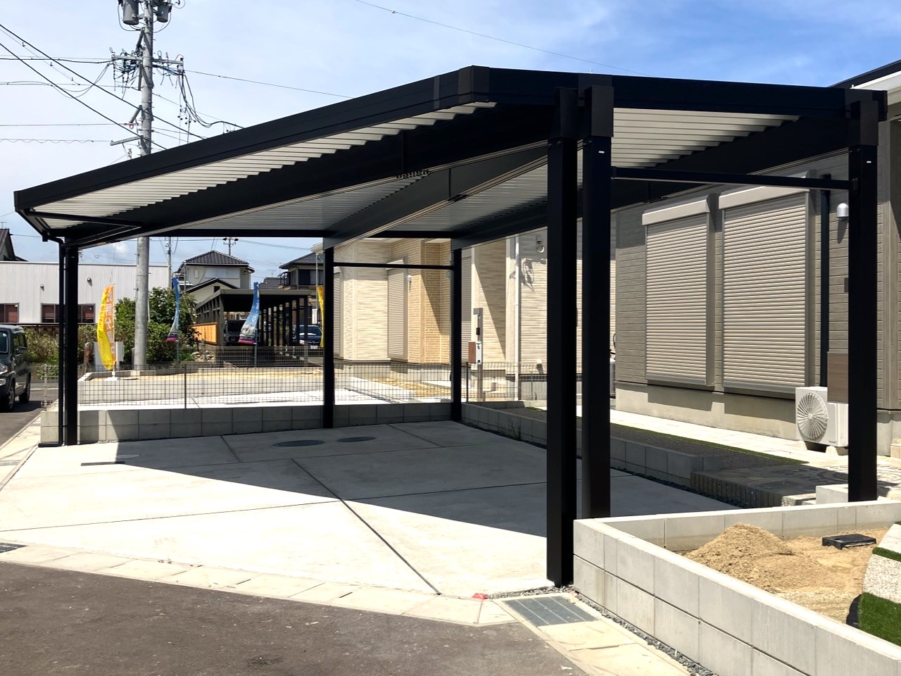 敷地形状に合わせて屋根の一部をカットしたカーポート、玄関前の天然石のアプローチ、美しい石を選んで組み合わせた植栽スペースなど、手入れが楽でありながら使いやすくと企画した新築住宅のデザインエクステリア!強風や積雪に強い折板屋根のカーポートを設けたほか、敷地内は平板、洗い出しコンクリート、人工芝、砂利敷きと使い勝手やデザインに合わせて施工しました。細部までこだわってプランニングした、平屋住宅のデザイン外構ができ上がりました。