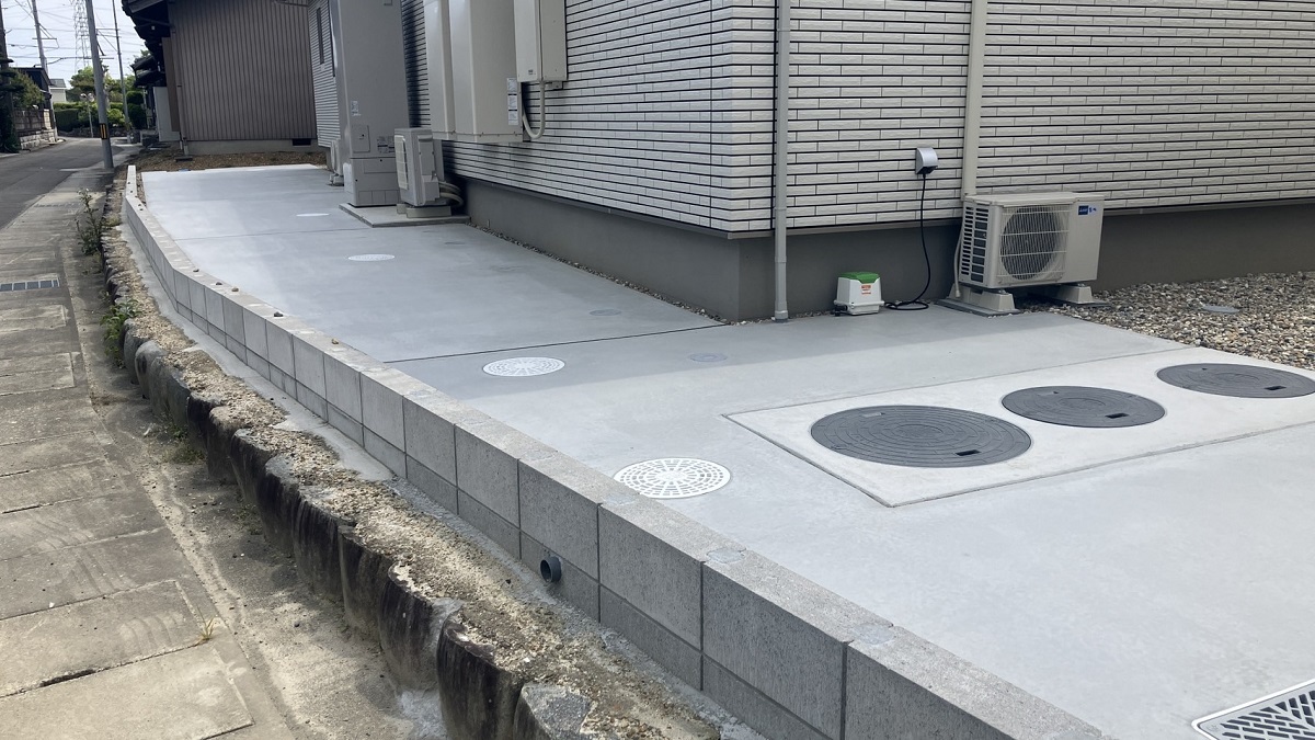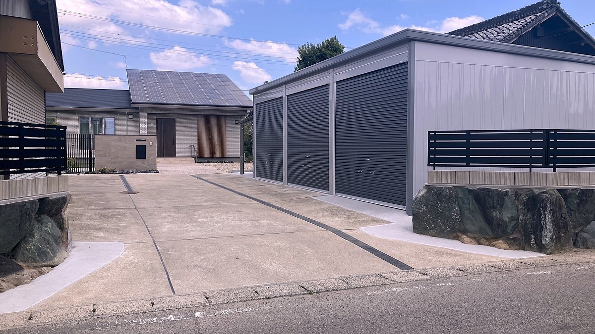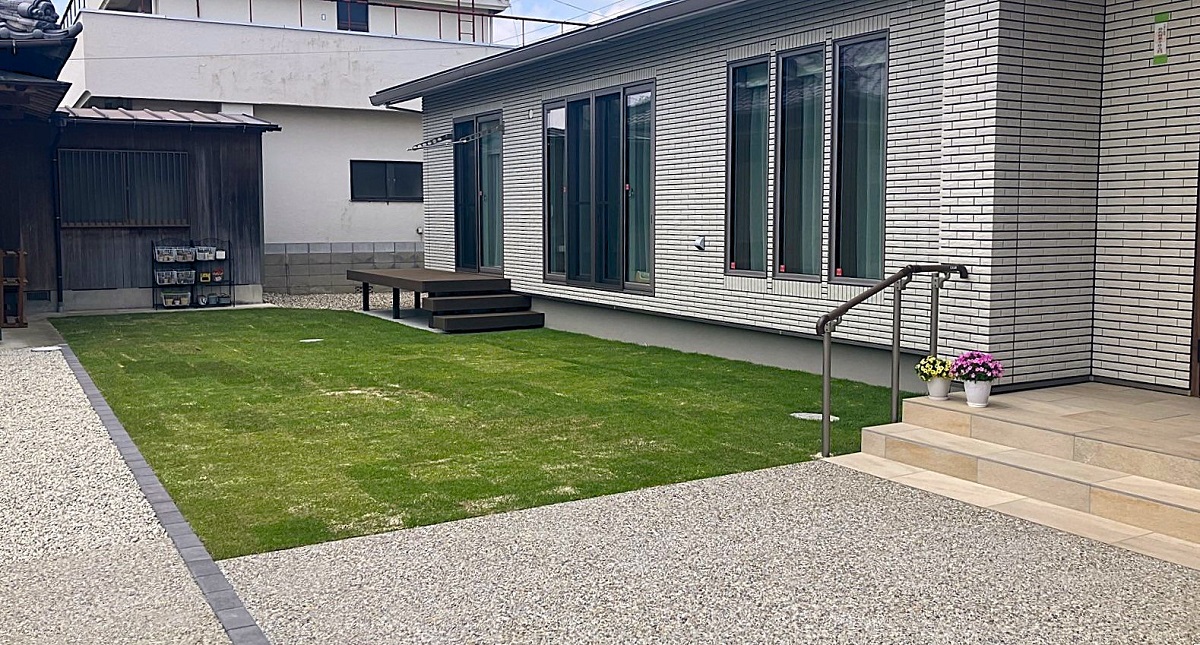 広い敷地に建つ平屋住宅のデザイン外構施工事例!住宅の外観デザインによく合うこだわりの造作門柱や芝生の庭につながるウッドデッキ、洗い出しコンクリートの玄関アプローチ、大型ガレージなど、隅々まで使いやすくと企画したデザインエクステリアが完成しました。